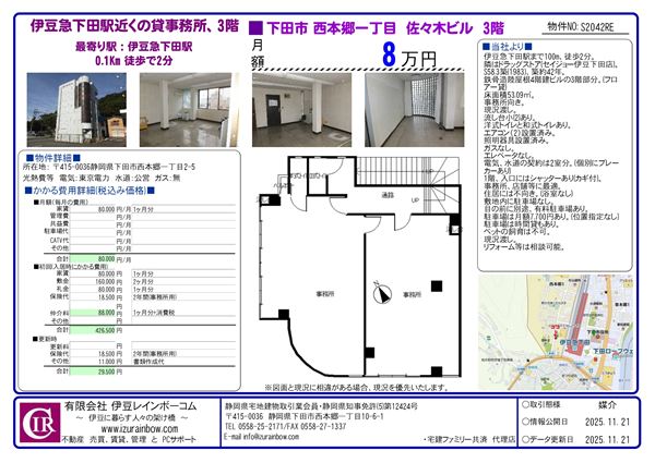 | 下田市西本郷一丁目 伊豆急下田駅、100m、徒歩2分 4階建てビルの3階部分、事務所、店舗等向き エアコン(2)、トイレ(2)、照明器具付 家賃 月額8万円 |