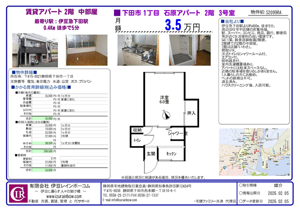 | 下田市一丁目 賃貸アパート 単身者向き 2階 間取り1K 家賃 月額3.5万円 |