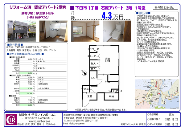 | 下田市一丁目 賃貸アパート 単身者向き 2階角部屋 間取り 1K H30.7(2018)リフォーム済み 家賃 月額4.3万円 |