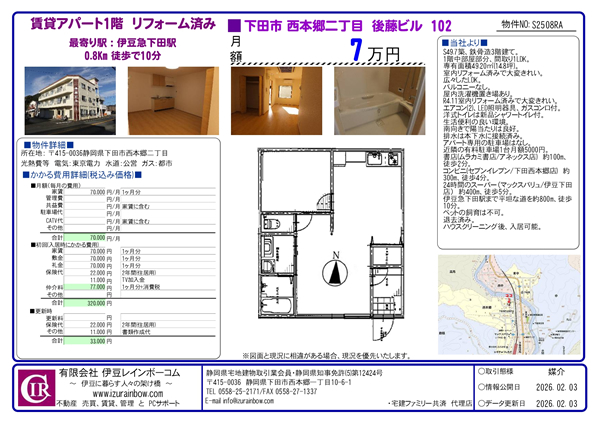 | 下田市西本郷二丁目 3階建ての賃貸アパート 1階中部屋 R4.11室内リフォーム済み 間取り1LDK 家賃 月額7万円 |
