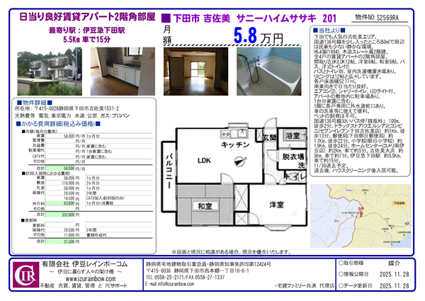 | 下田市吉佐美 日当たり良好な賃貸アパート 2階角部屋、間取り2LDK 駐車場(1)、エアコン(2)、シャワートイレ、LED照明器具付 家賃 月額5.8万円 |