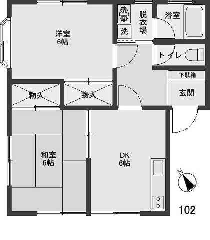- 間取り2DK(洋室6帖、和室6帖、DK6帖、バス、洋式トイレ、洗面付)バスとトイレ別。