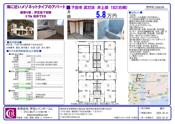 | 下田市武ガ浜 海に近いメゾネット式アパート 一部リフォーム済みできれい 間取り5K エアコン(2)、LED照明器具付 家賃 月額5.8万円 |
