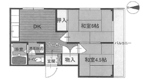 | 下田市中 業務スーパー横の賃貸アパート 2階角部屋 間取り2DK、エアコン(2)、シャワートイレ付 家賃 月額5万円 |