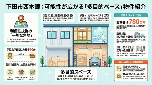 - 店舗、倉庫、作業場、ガレージ等に最適。(現状、浴室なし)