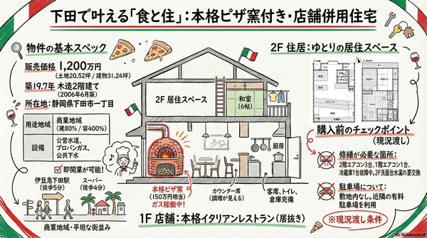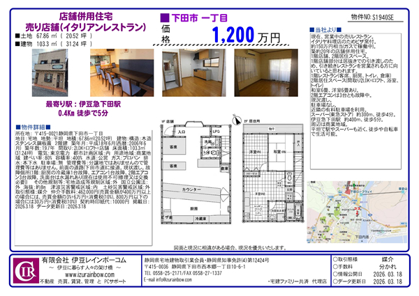 | 下田市一丁目 売りイタリアンレストラン、ピザ窯付 店舗併用住宅、1階店舗、2階居住スペース 周辺は商業地域で平坦地 伊豆急下田駅まで約400m、徒歩約5分 1,200万円 |